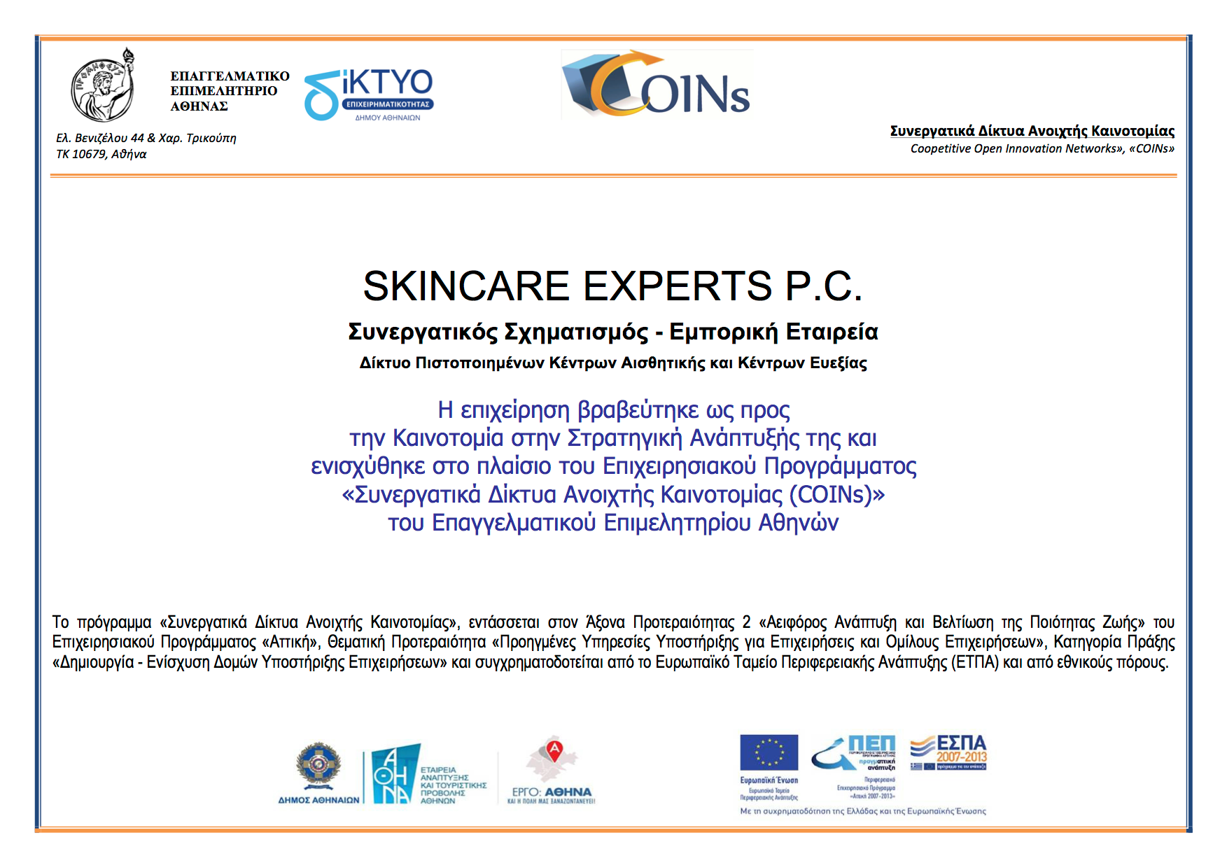 Οι SkinCare Experts, είναι ένας συνεργατικός σχηματισμός 15 κέντρων αισθητικής, που υπό την αιγίδα του επαγγελματικού επιμελητηρίου Αθηνών και τη στήριξη της Ευρωπαϊκής ένωσης, βραβεύτηκε και επιδοτήθηκε ως προς την καινοτομία του. Κύρια δράση του είναι η δημιουργία ενός φορέα πιστοποίησης και η κατοχύρωση ενός σήματος ποιότητας με στόχο τη διασφάλιση της ποιοτικής παροχής υπηρεσιών αισθητικής για το καταναλωτικό κοινό.